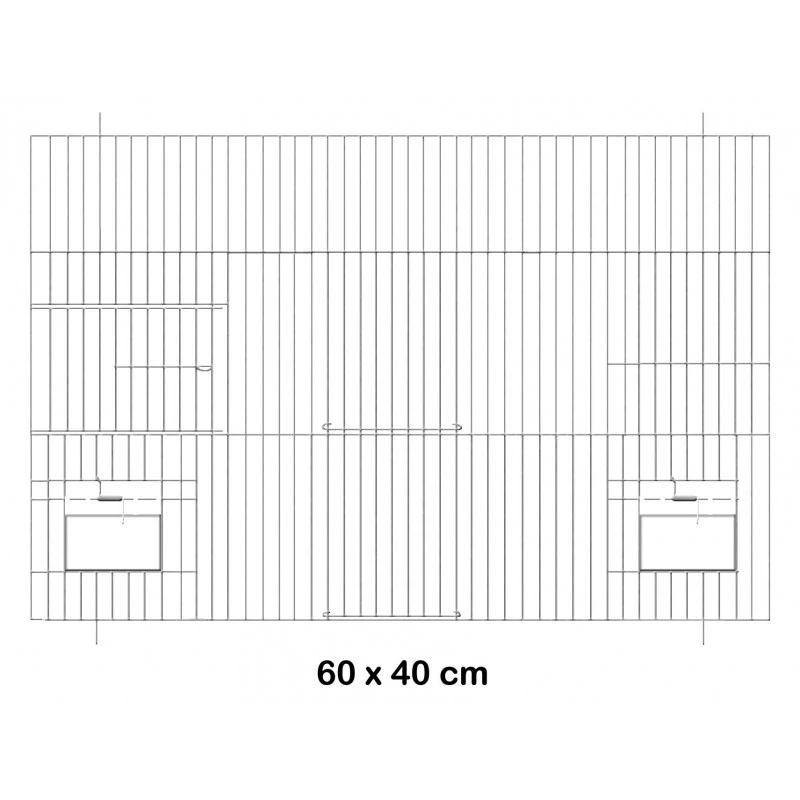 - Façade de cage chromée pour la construction de batteries pour becs droits et perruches comprenant 1 porte à guillotine, 1 porte latérale pour le nid extérieur ou la baignoire et 2 portes mangeoires en plastique.